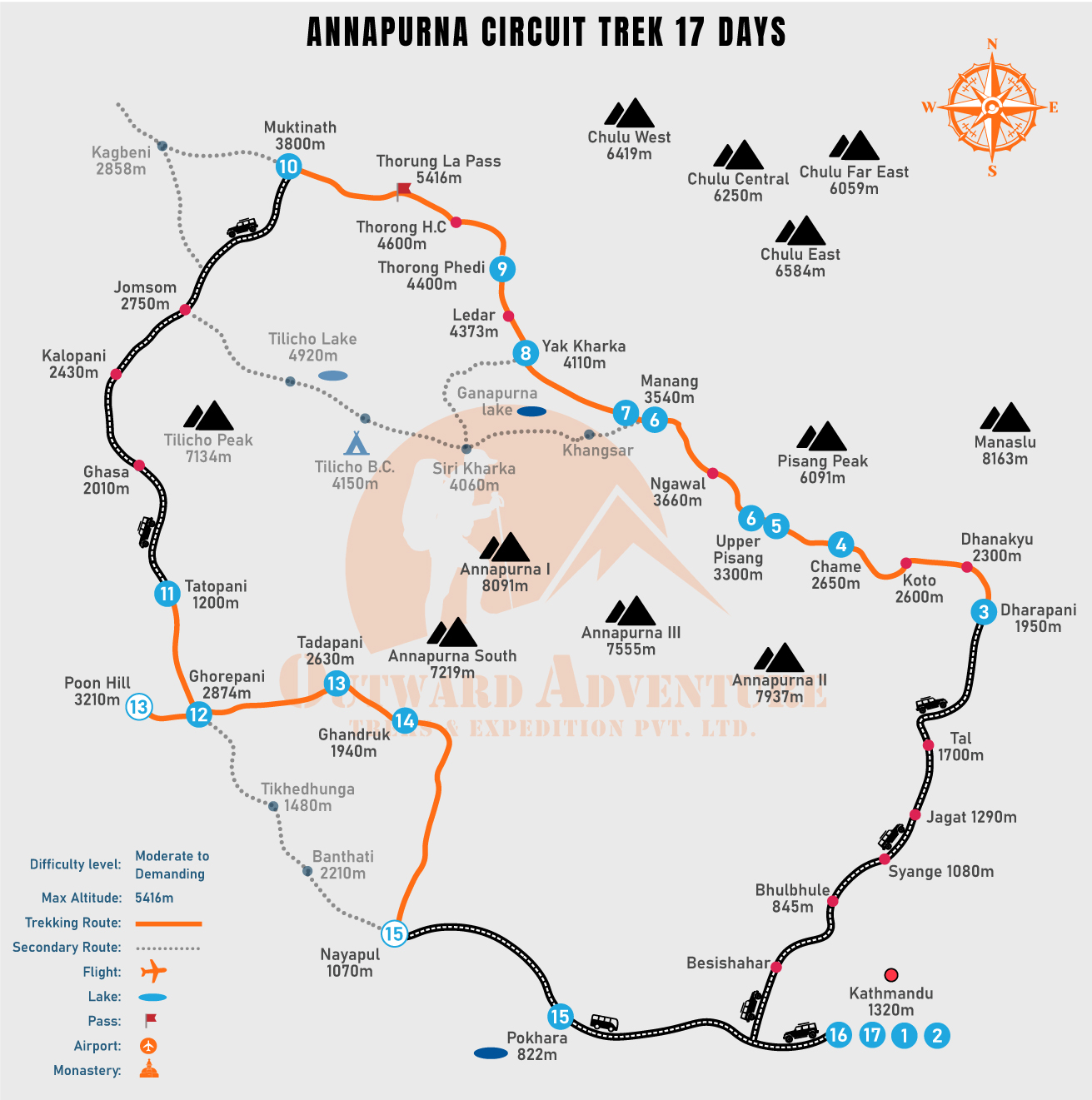The Annapurna Circuit trek requires around two weeks of time, but most of the hike is easygoing. Gradual climbs and well-marked trails with frequent restaurants and lodges to take a break. What makes it challenging is the tough day you climb the Thorung La Pass and the altitude after Manang.