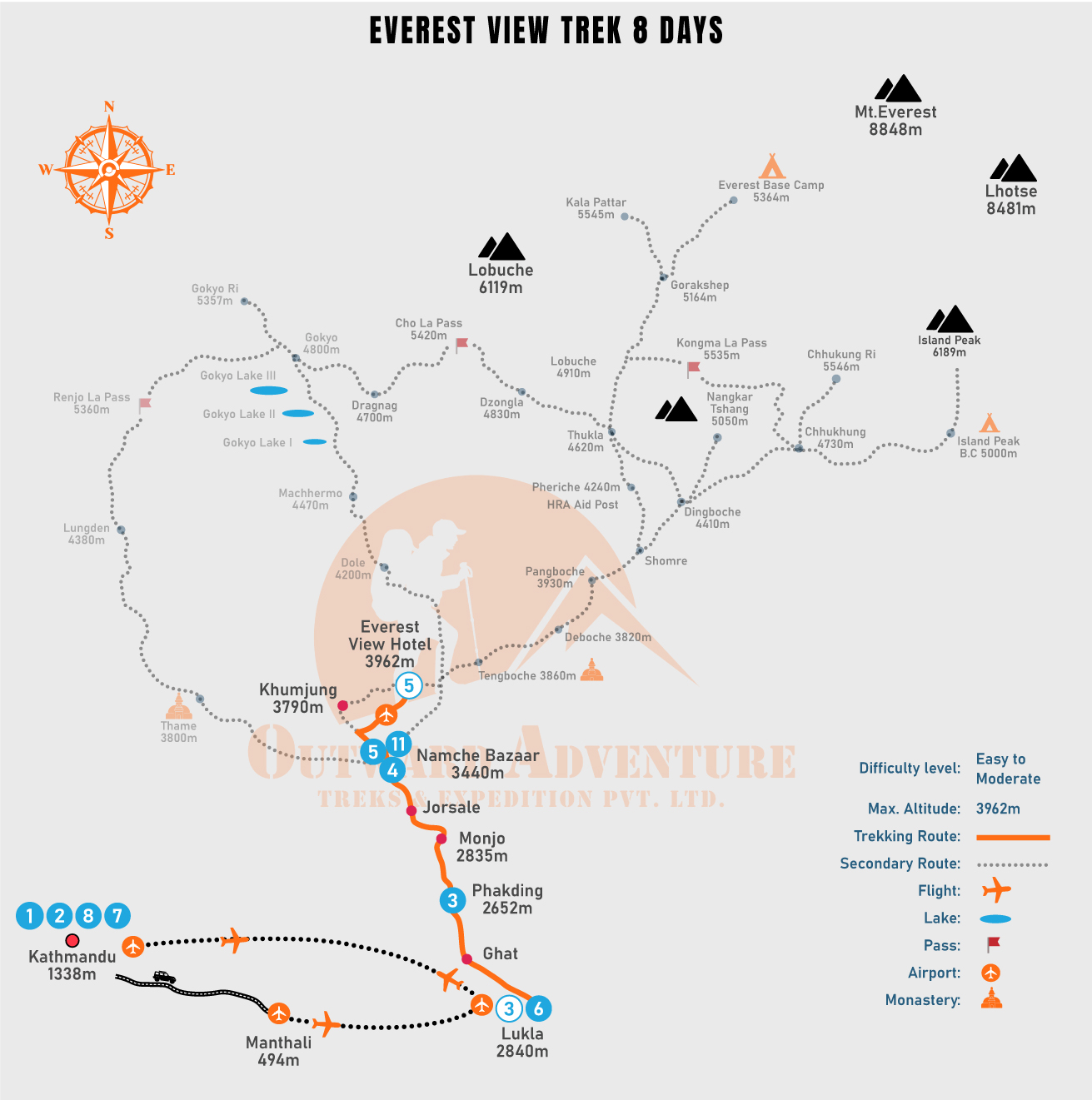 Throughout the trek, trekkers will explore almost every aspect of the Khumbu region from the friendly Sherpa people, picturesque villages, a great variety of cultures and traditions, colorful festivals and monasteries of this region, and so on that provide the lifetime memory to the visitors. Short Everest view trek can quickly be completed with moderate physical fitness as the highest altitude of this trekking trail is only 3,962m, the Everest View Hotel.