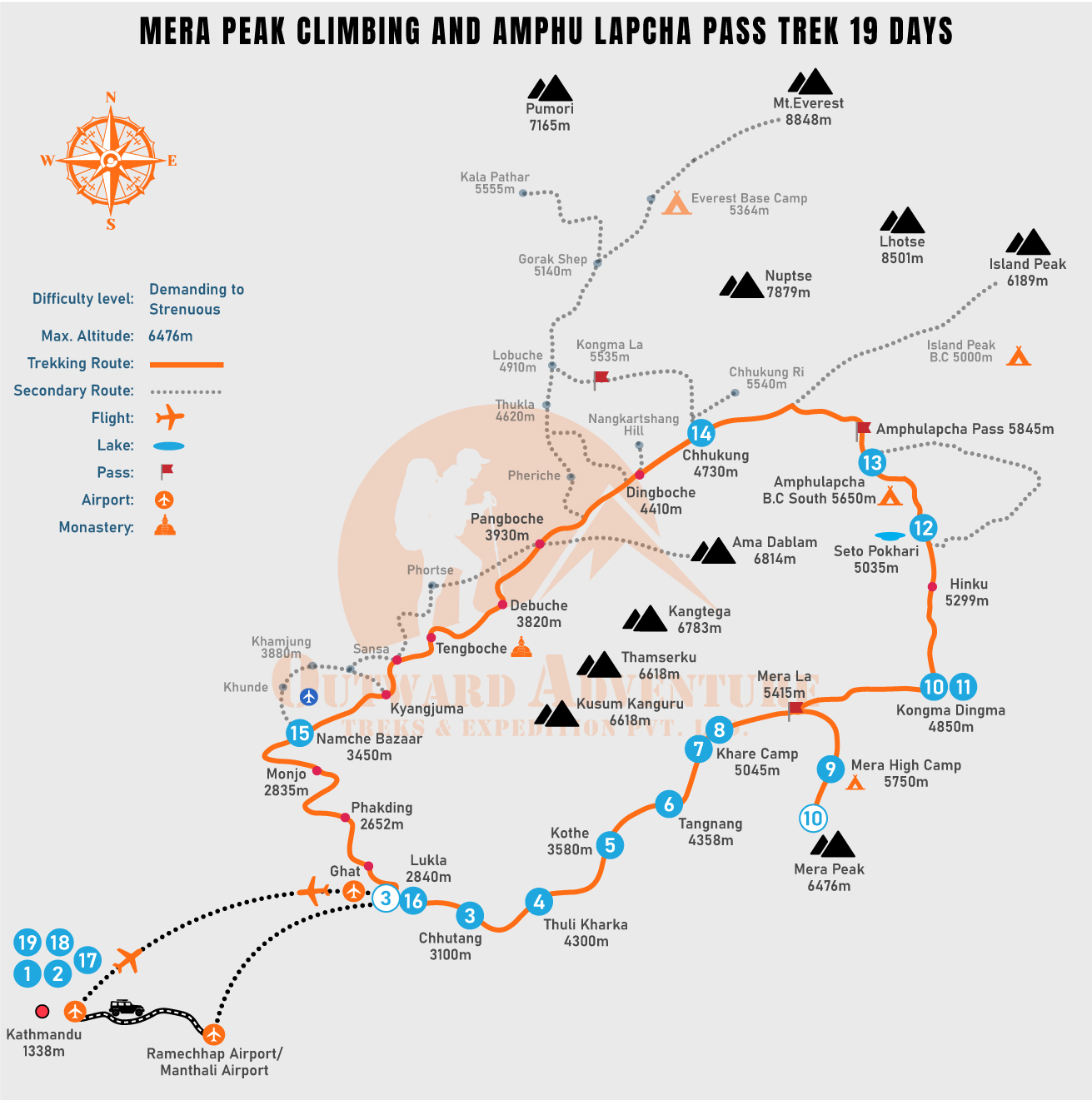 All in all, we follow the route of Kathmandu – Lukla – Chutanga – Thuli Kharka – Kothe – Tagnag – Khare -Mera Peak High Camp – Mera Summit – Konga Dingma – Seto Pokhari – Amphu Laptse Base Camp –Amphu Laptse Pass – Chhukung – Namche – Bazaar – Lukla – Kathmandu