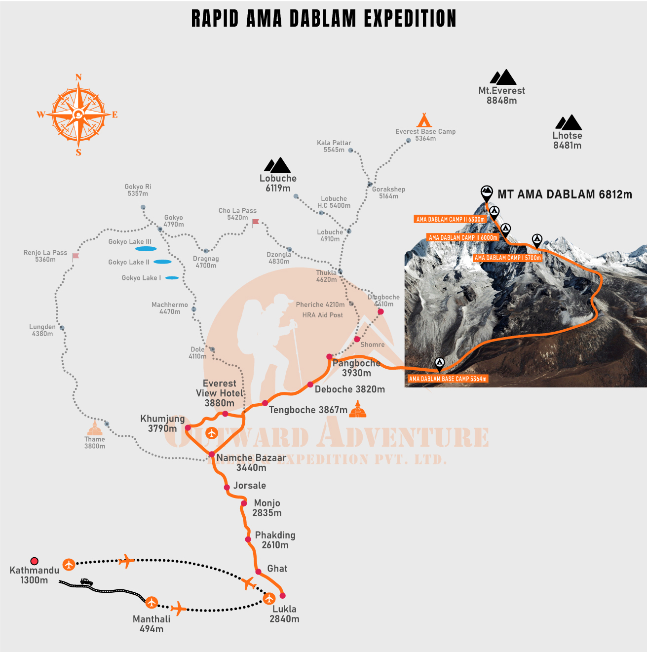 A journey to Ama Dablam Expedition begins from Kathmandu. On the first day of the journey, we land at Kathmandu and the next day we fly to Lukla and begin trekking. In the trekking, we follow the beautiful Everest Base Camp trek trail till we reach Pangboche. Then leaving the EBC trail, we catch the Ama Dablam Base Camp trek route. Reaching Ama Dablam Base Camp, we set a journey gradually to Camp I, and Camp II, and move further for the final summit.